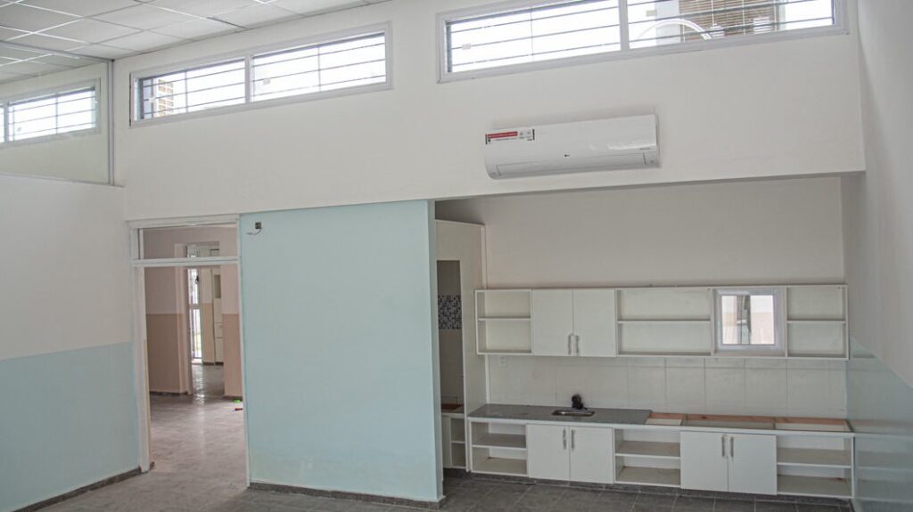El edificio contará con 3 aulas de 54 m² con baños, un SUM, cocina equipada, áreas administrativas (secretaría y dirección), sala de máquinas y patios con espacios verdes especialmente planificados.