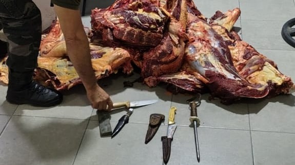 Al inspeccionar la caja del rodado, los uniformados descubrieron diversos cortes de carne vacuna esparcidos sin ningún tipo de protección, careciendo totalmente de cadena de frío y de las normas higiénico-sanitarias básicas. Además, se hallaron cuchillas y herramientas vinculadas a la faena de animales.